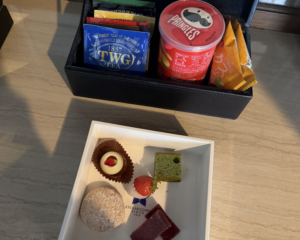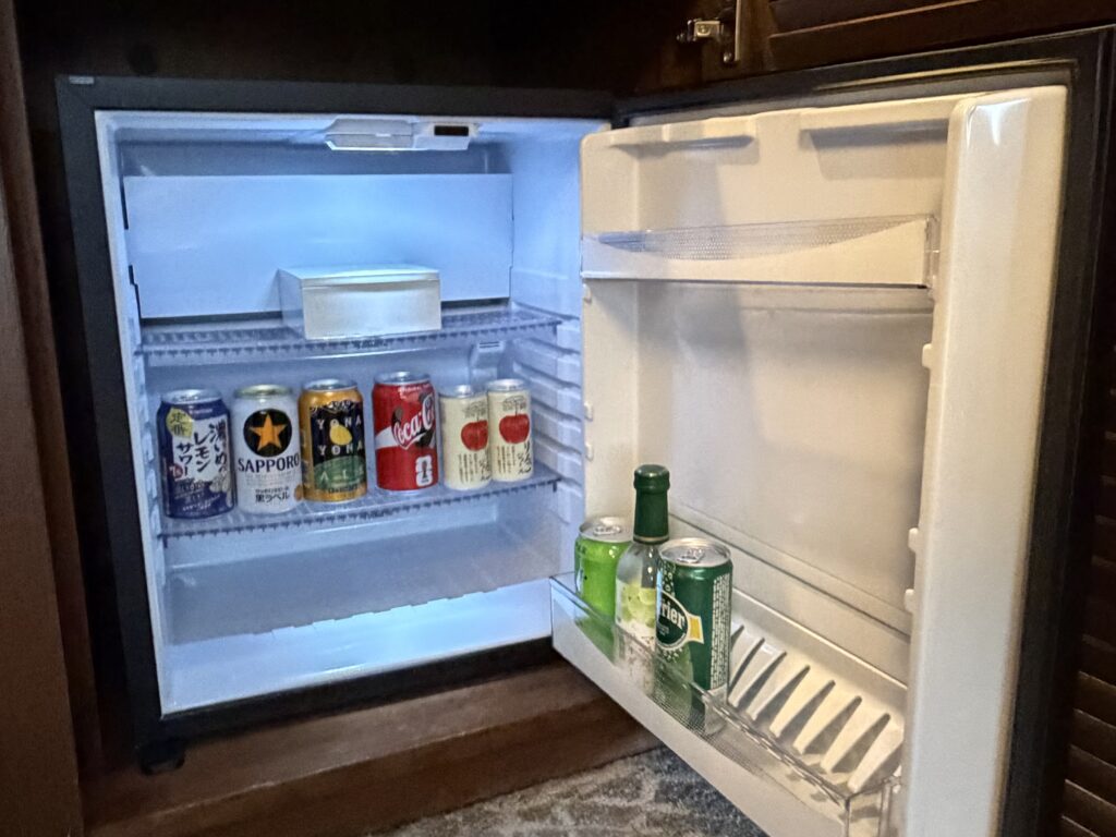 お部屋の冷蔵庫にはフリードリンクが用意されていて、ちょっとしたスナックやお菓子も置いてありました。