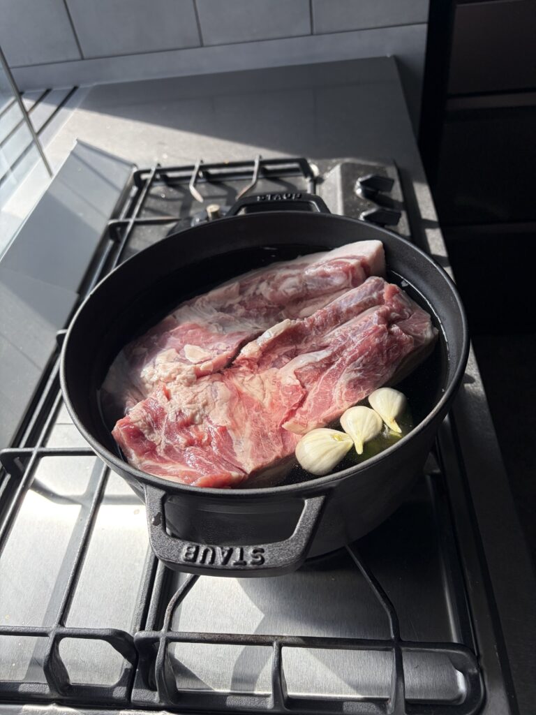 1. 鍋の底に野菜(ネギ、玉ねぎなど)を敷き、その上に豚バラブロックをのせる。