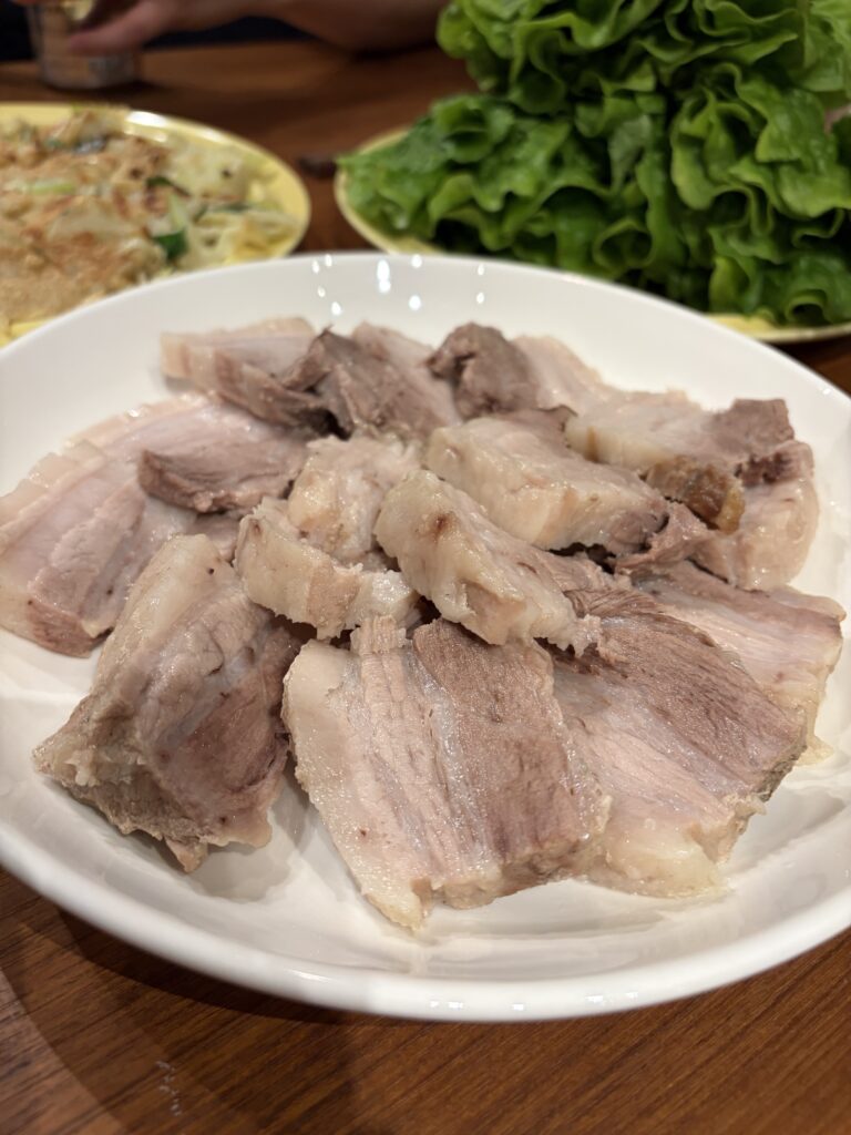 息子はポッサムが大好きで、サンチュやサニーレタスにお肉をのせて、野菜で巻いてたくさん食べてくれます。大人はそこに大葉やネギをプラス。巻く野菜を変えたり、ナムルなど一緒に巻くだけで味わいがガラリと変わるので、最後まで飽きずに楽しめるのが魅力です。